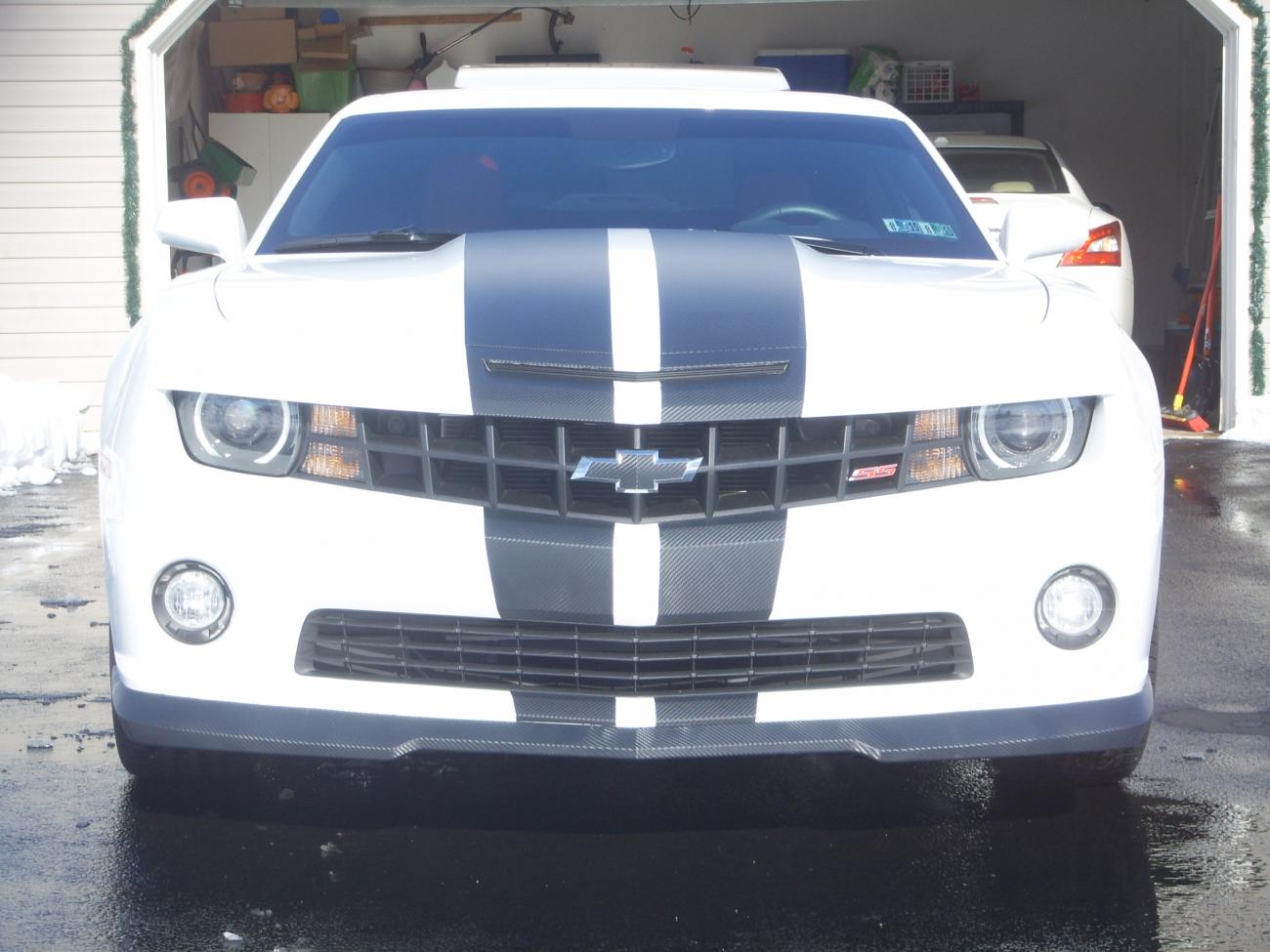Remember the Matte Black Camaro from Germany that was on the Homepage? It was actually a vinyl material that the guy wrapped onto the car. The stripes on my car are made from a similar type material. Its made by 3M, and it actually has a textured feel to it. I have the bottom lip wrapped too, and people swear all the time that its real carbon fiber, or a carbon fiber hood that I painted white. We only did the front to see how the material would hold up on the car. If it does, I plan on doing the rear as well.