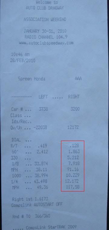 Top Ten Class: Bolt-Ons and Internal Engine Modifications Tires used on the pass: Nitto NT 555R on 20" wheels Performance Mods (if any):Engine/Heads/Cam, Headers, Exhaust, CAI, 3000 stall, tune. R/T:............ .128 60':........... 1.863 330':......... 5.212 660':......... 7.918 660’ mph:... 91.16 1000'......... 10.229 1320'......... 12.172 1320’ mph…. 117.58 Name/Location of the track: Auto Club Dragway Date of pass: 2/28/2010 Weather conditions: 1350 DA = 11.995 @ 119.344 MPH(DA corrected) IAT's were in the 140's from staging for almost an hour so timing was being pulled. The tune is a work in progress. Need to get into the 11's N/A. I'm on the right: