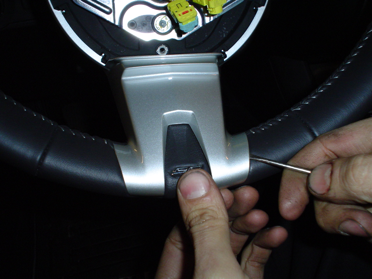 first step as always is to disconnect the battery so as to not set off the airbags. dont be afraid of them if you are careful they are not a problem with no power. there is a small hole in the side of the steering wheel insert a small tool i use a flat blade pocket screw driver and push in on the metal tabs i took pics of the tabs w air bag off to show you what you are pushing against