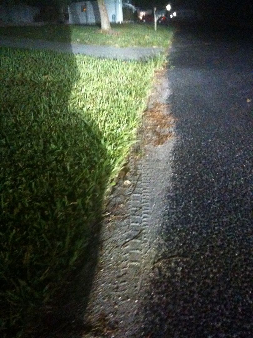 I got some evidance that supports the getting hit in the driveway theory... Check this... saw it coming in just a while ago. See the tire tracks in the sand and there is an impression in the grass!