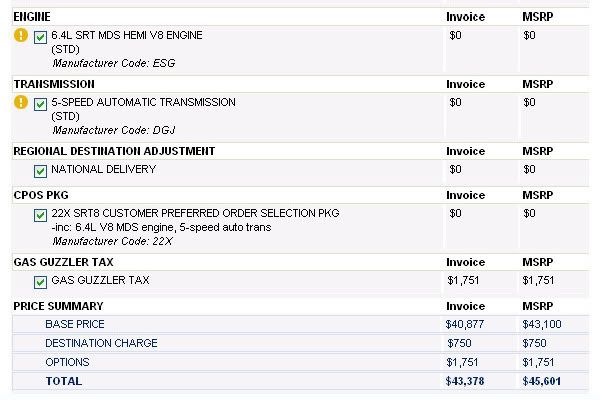 Back on topic, the price of the SRT8 is going up almost $2000, based on the figures on the NADAGUIDE.COM website. As Stew said, MSRP of $43,100 and adding GG Tax & Destination it comes $45,601. I bought my SRT8 in December of 2008 for $1700 under MSRP, and they are being bought today for under invoice. A year from now I expect the new 6.4L SRT8s will be able to be bought for $43,000 or less ($43,378 Invoice)... Six Speed cars and the few available options will increase the price.