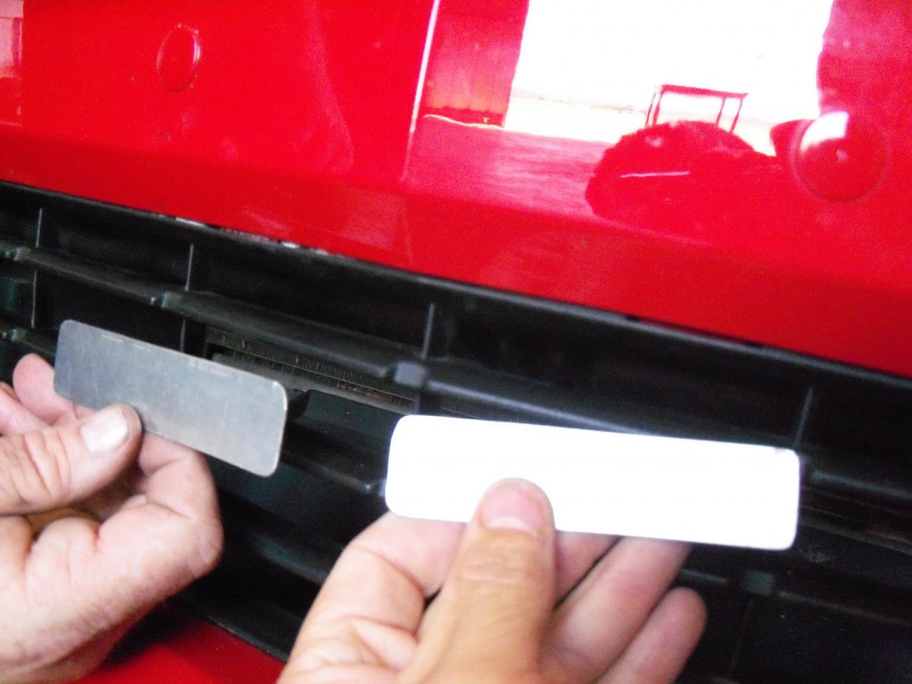 ![]() Couple white zip ties and a little fold of the plate and two tiny holes in the center of the plate works quite well, and takes about 8 min and you have nothing on your car and its a simple snip of the zip ties when you head to your local track!