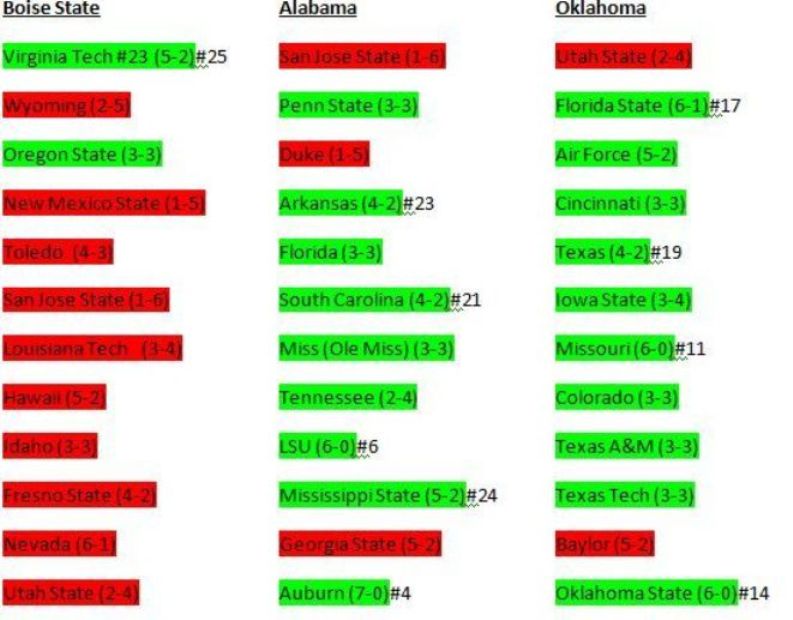Look at OK, played Fl. St, Texas, Missouri this weekend, probably Nebraska, 4 good teams.