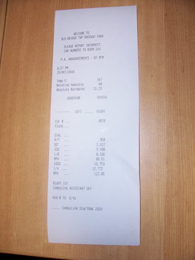 Thanks man! I would definetly do the skinny`s and a smaller set on the back, I would think that would give you another tenth and a mph at least. Go in november, another tenth and mph... So you would easily have the top spot, or add a stall converter too and you will never have to worry about the top spot being taken away. You probably won`t have to worry anyway but the stall converter would seal the deal.
