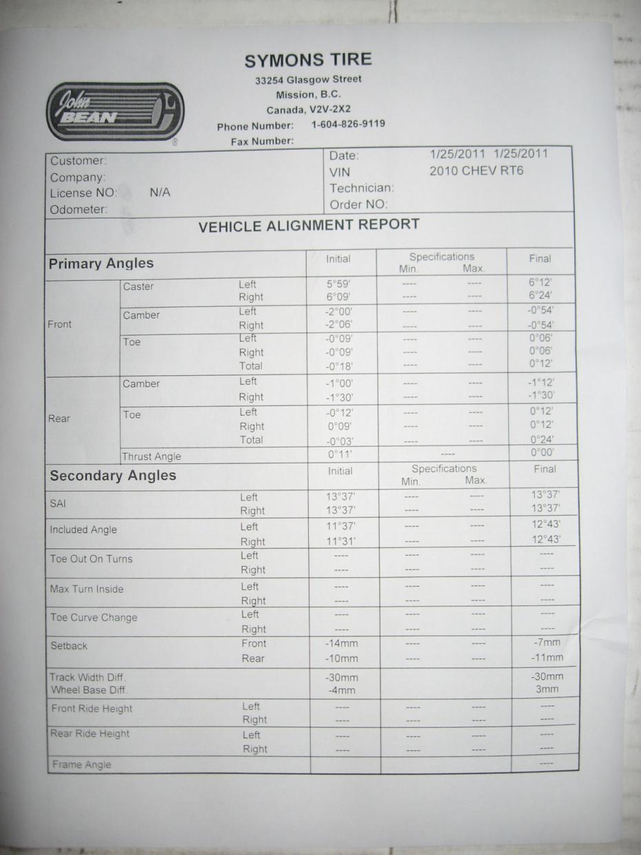 Today was the day to go to the alignment shop. As much as I hate driving Pumpkin in the rain, had to do it. Set a little different then stock spec's, should get in and out of corners a little better.