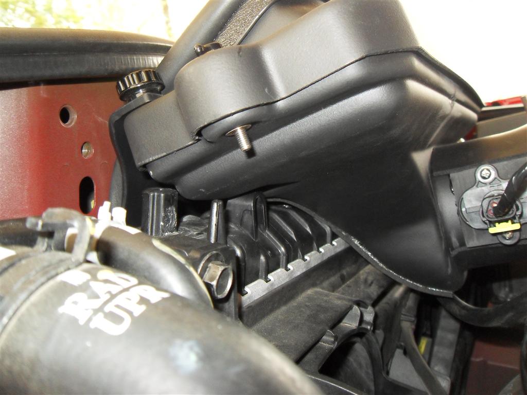 If you are still concerned and want the extra security of having those upper radiator brackets still attached, you can put them back on - if you do a slight modification. I took a minute with a hacksaw to remove the section of the bracket that bumps into the intake housing. A simple vertical cut followed by a horizontal cut that aligns with the lower side of the bracket. With this slight modification, I was able to install the bracket back in it's original position...just have to remember not to over-tighten the bolt, as you don't want to crush the rubber gaskets on the intake air deflector. After taking the pictures, I removed the modified brackets since I don't really see a need to have these installed also given the way the intake itself basically cradles the upper part of the radiator. But, the option exists for those that want the extra security.