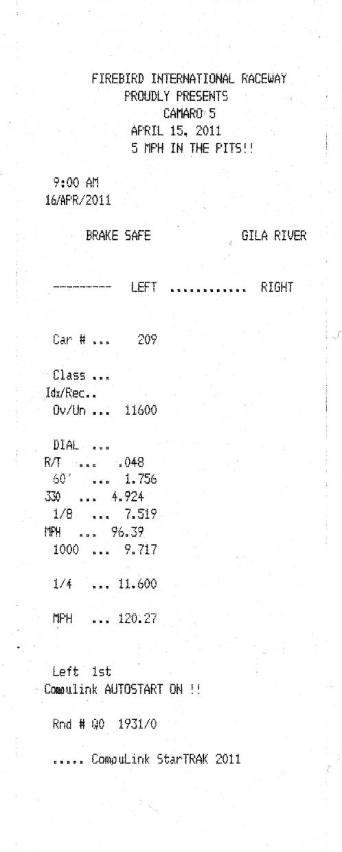 They announced the top 16 fastest cars at the driver's meeting before the finals of the bracket racing. They recorded every run that any camaro made the whole weekend. And the list included the Lingenfelter 8 second car. Garth might have Weld 17" wheels and skinnies but he never got below the 12's until he ran an 11.9 in eliminations, when he broke out of his dial in to be eliminated. Then his clutch was also gone. Ted never got below the 12's either. Then he broke his shifter off at the pivot point. Here's the time slip for all you doubters....I even put up a pic of my car with the car number to correspond to the time slip.