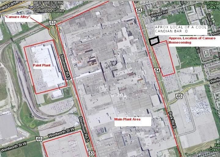 If you're going on your own then the best advice is to go down Park Road south of Bloor Street. The whole Camaro Homecoming venue will be in the GM parking lots directly across Park Road from the plant. To give you an exact street address is tricky. Why? Because the plant is huge. The main plant property covers about 400 acres and that's before the paint plant! Add on the paint plant and all the parking lots surrounding the plants and you easily double that figure. I'll post a picture later to give you an idea.