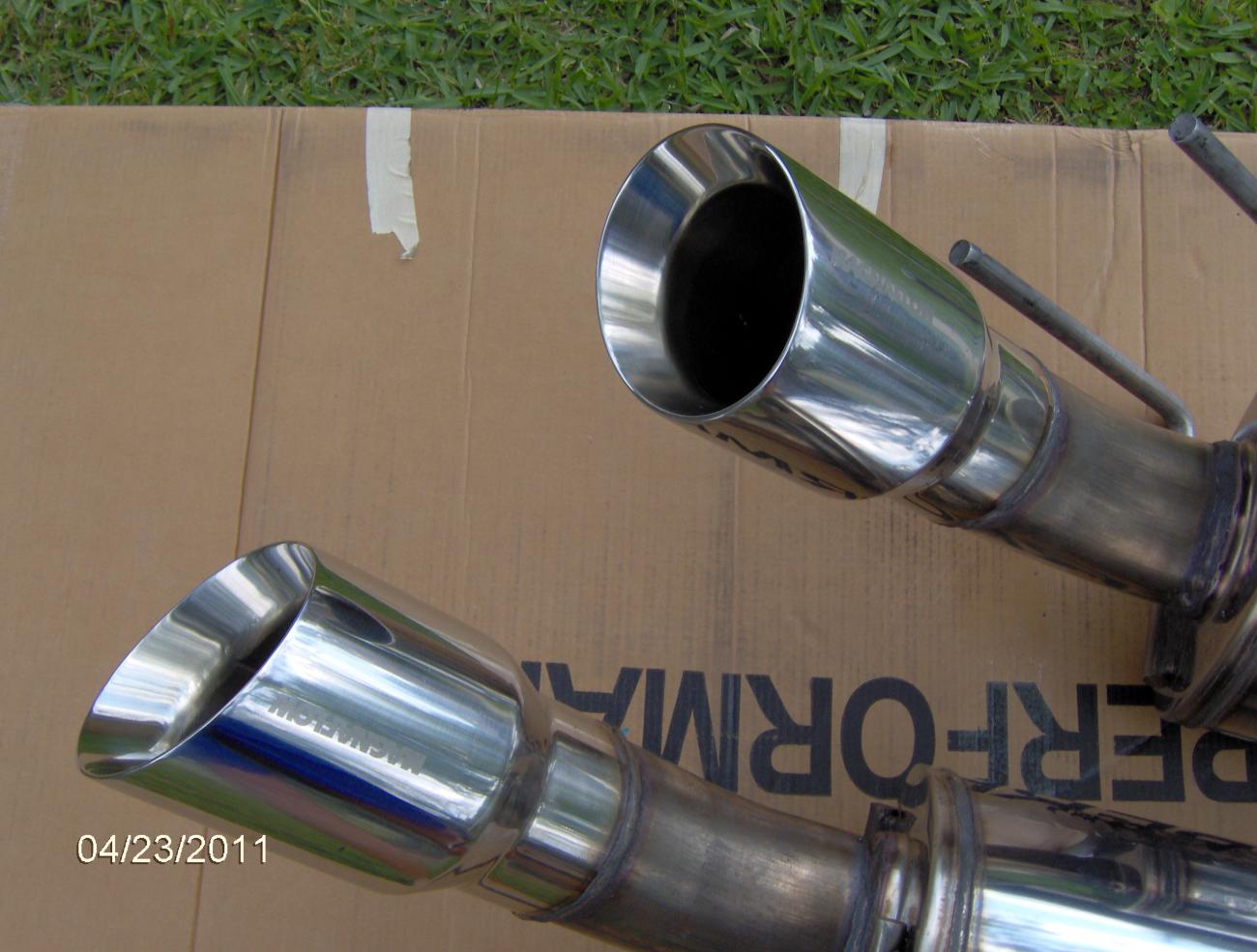 The Magnaflow is a V8 COMPETITION SERIES; 5 x 8 x 14in. Muffler; 3.0in. Tubing; 4.0in. Polished Stainless Tips, Part #16483 with an X pipe. The system fits and sounds great. Magnaflow list price is $1734.28. I am selling for $750.00 + shipping. If you live in Louisiana we can try to arrange a pick up. Feel free to ask any questions, and PM me if you are interested.