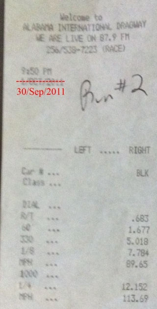 ![]() 1/4: 12.152 @ 113.69, 1.677 sixty 1/8: 7.784 @ 89.65 Place: Alabama International Dragway Date: 9/30/2011, 9:45pm CT DA: about 1300 Bolt-ons: Shorties, Exhaust, CAI, Converter, Tune, 18'' DRs, 3.45 gears, UDP, EWP Link to build and discussion: http://www.camaro5.com/forums/showpo...&postcount=273 Padre
