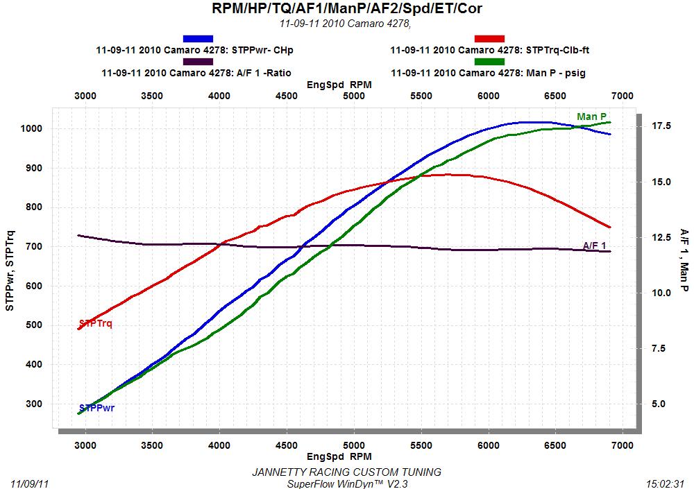 2010 Camaro Transformer edition LS3 M6 Current Mods LPE 427 with JRE Magnum Custom blower cam Package ID-1000 injectors Vortech YSI tuner kit Vortech Cog Drive upgrade JRE Vortech Upgrade Package JRE Custom Return style Fuel system Triple fuel pumps with Triple MSD FPVB. Stainless works 2 inch headers w OR pipes Magnaflow 3 inch exhaust with JRE Mod. ZR1 Clutch kit RPM Transmission DSS 9 inch package with 4.10 gears BeCool Radiator Bogart Wheels Pfadt Control arms and toe links BMR Front Springs only for the Raked look QTP Electric Cutouts JRE Custom Dyno Tune to bring it all together. Results 1017 RWHP 883 RWTQ