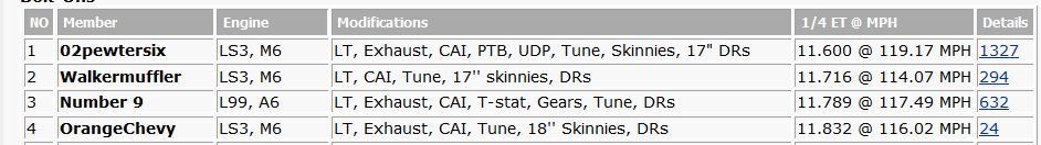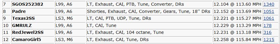 For example the best time for a stock 2010 camaro is what,12.6? The average "best" is probably closer to 12.9-13.0 with the average run probably closer to 13.2-13.3 Not only that but the times you listed are people running drag radials which will typically give you better traction (ET) than street tires |