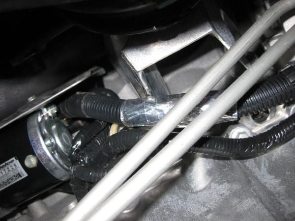You can see where the tape is applied on both the positive cable and the engine mount. After loosening up the positive cable an installing the two copper washers and one brass nut there was plenty of slack. There was no need to file on the engine mount; the mount had no sharp edges on it.