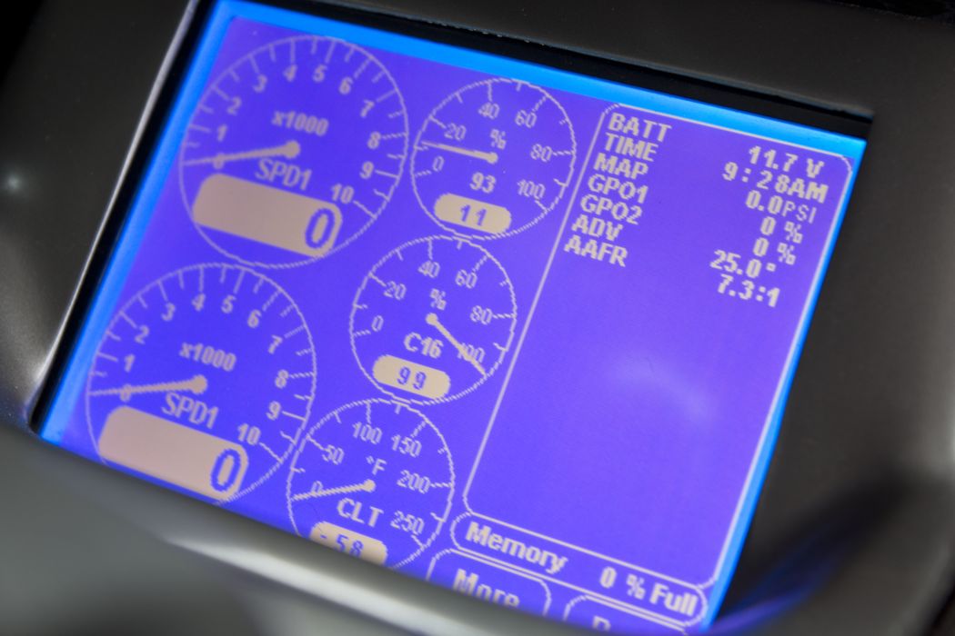 3) Data Logger. In this screen: engine rpm, driveshaft rpm, 93 octane fuel level, C16/C23 fuel level, intercooler coolant temp. It is continually logging voltages, boost, A/F and some other goodies.