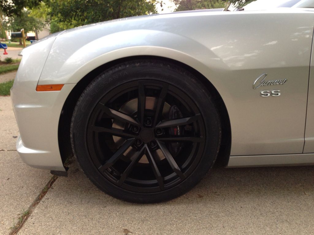 These are satin black, ZL1 offsets, Michelin 315 & 285's. ![]() ![]() ![]() Before: ![]() After: ![]() My only concern is the offset in the rear. The car sits a bit lower in the back, I'm guessing because of the extra weight of it being a convertible. The wheel is pretty darn close to the fender.... guess I "need" coil overs...