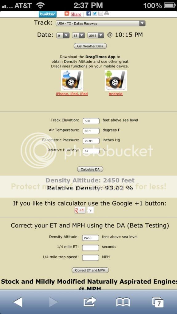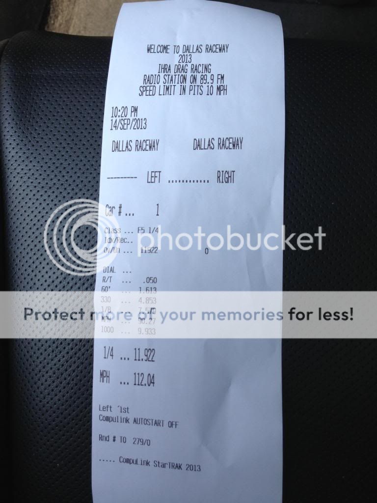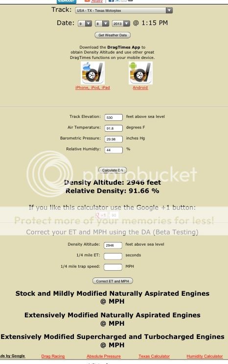 ![]() Left lane. Bolt Ons Only without internal modification. Same mods as my official fast list run except added gears and PI. Dragtimes has this run at 2946 DA @1:15pm @ Texas Motorplex on 9-8-13 This is the DA calculator pic CORRECTED TIME IS 11.596 @115.954 Bolt on only no internal modification #1 spot on Unofficial List ![]()