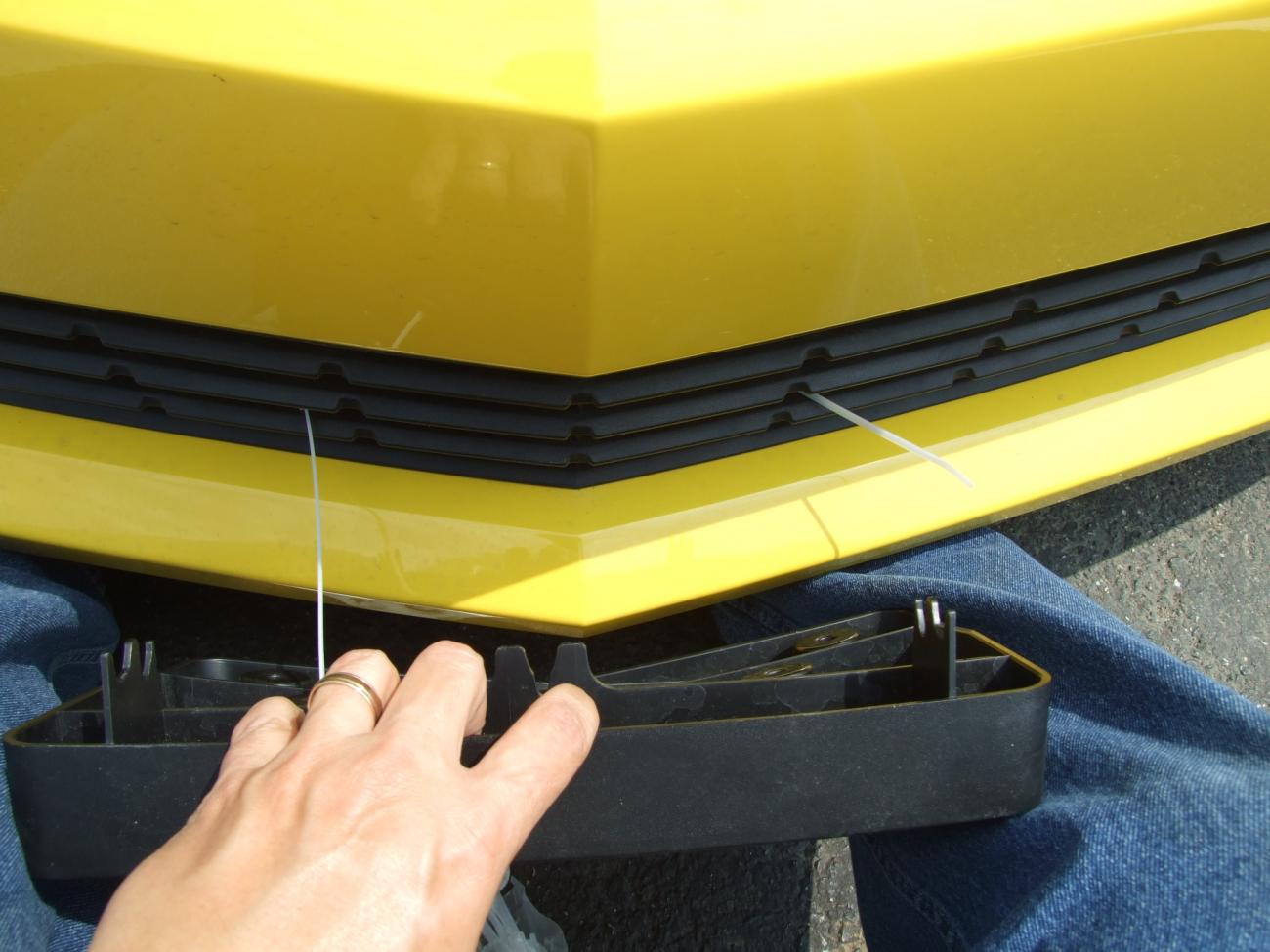 2. Feed the tie-straps around and through the egg crate lower grille, put the upside down plate bracket up against the car, hold with your knees and tighten the strps slightly - go from the left hole to the right and tighten tie-straps evenly.
