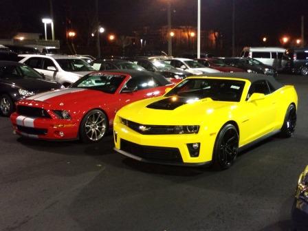 Picked up the new ride last night, drove it home, and now it's stored for the winter (that wasn't much fun). With the very brief 30 mile trip home, the ZL1 is a much different car than the Shelby. The Shelby is much more "raw" (at least between a stock ZL1 and my KR modified GT500) and the ZL1 has an incredibly flexible suspension. As far as power can't tell much since the tires were way too cold. Overall very impressed so far and looking forward to meeting some fellow owners. Attached is a pic of both my new and old rides. Thanks to Les Stanford in Dearborn for a great dealer experience (my salesperson was Erik Hibbard and worked with Chris Warren during the delivery - Chris is a very knowledgeable guy re: GM Performance)