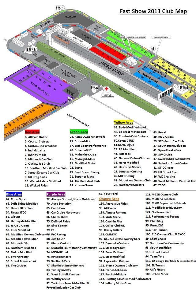 Here is a pic of last years layout, Orange and purple is grass. Red/Green/Blue and Yellow are the best parts for displays. Last Year i was with number 23 in the green section very good area. The better sections are for people who have booked up months in advance or are good friends with the organisers, Seeing as DNAndus paid up quite a few months ago we may have a good section
