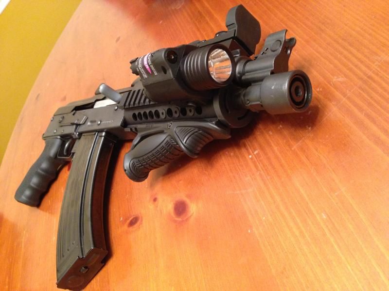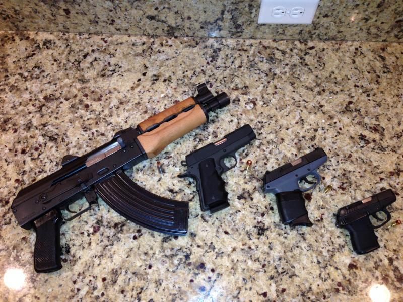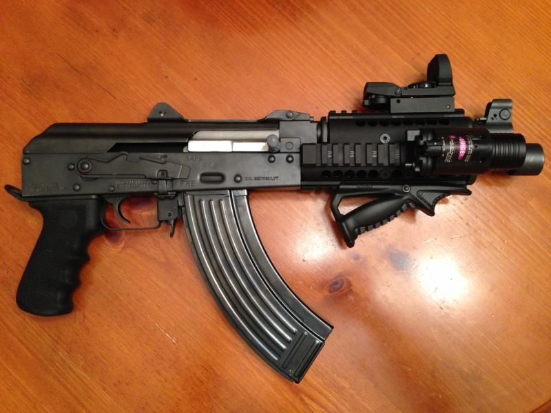 Kel Tec P3AT / .380 (EDC) Kel Tec P11 / 9MM (Winter carry) Rock Island Armory 1911CS / .45ACP Century International Arms M92 / 7.62x39 ![]() The M92 is the newest addition...and I went a little mod crazy. Hogue grip Single point sling adapter Quad Rail Angled Foregrip Reflex sight LED flashlight/laser ![]()