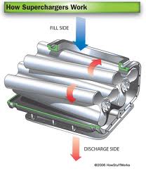 A twin screw is similar in design, as it has two rotor but the main difference you will notice is the number of lobes on each rotor are different and they draw air in from one end and return it to engine from the other end of the lobes. The reason for this is because the lobes have a tighter clearance as they move from on end to the other (creating pressure before it leaves the supercharger). (Whipple, KenneBell,)