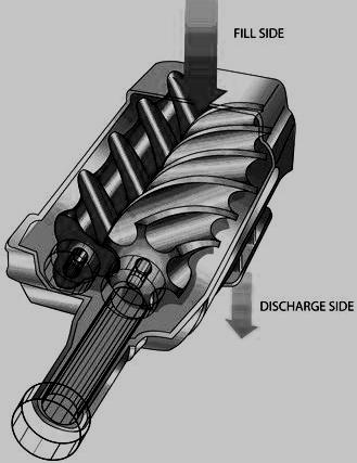 Twin-screw blowers force the air BETWEEN the rotors, one rotor spins faster than the other rotor (unlike roots which spin at the same speed), they also compress the air as shape of the lobes cause the cavity between the rotors narrows down towards the discharge side.
