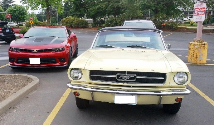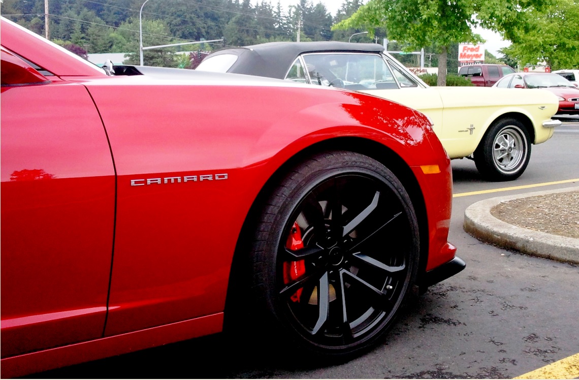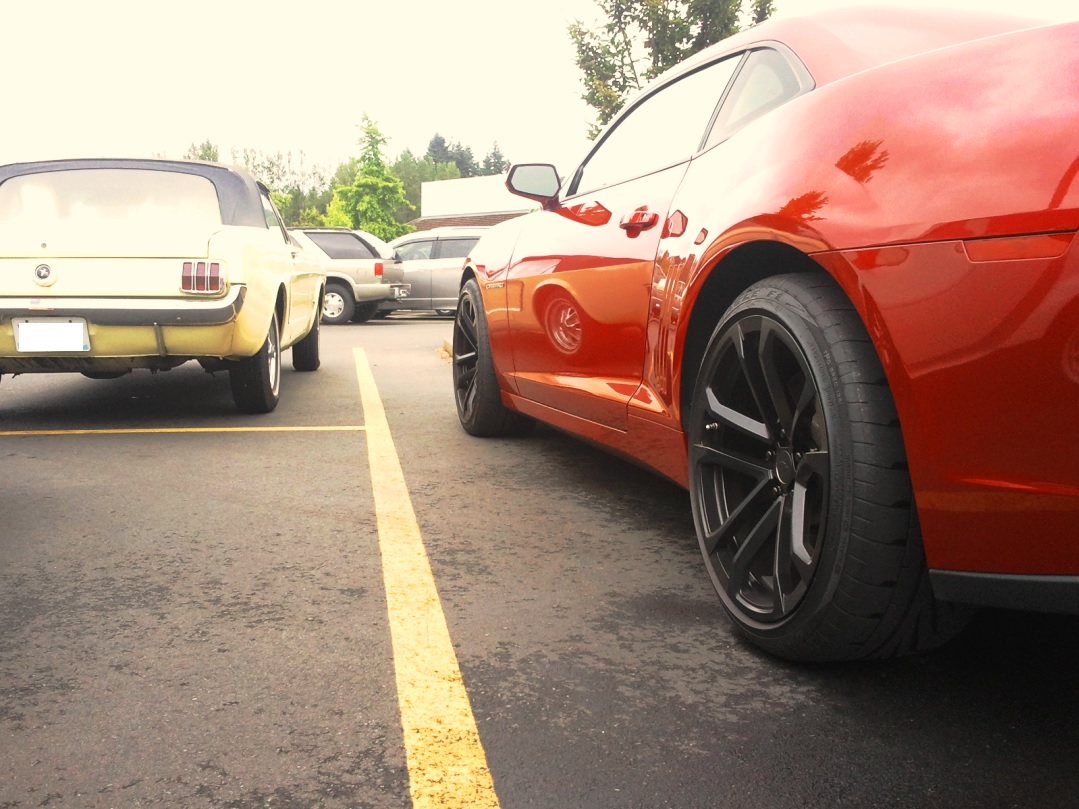 I had an older Mustang park adjacent to my car. I found it amazing in the difference as far as tire size and overall car size. The photos I took were with my cell phone so I added some color via my photo app. Not to much but enough.