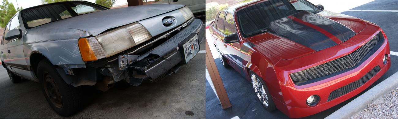 Just look how the front fenders flow from horizontal Camaro bumper to Taurus sides. Look how the shrunken bumper looks seamless! How the fender flares tuck those front tires in just so! “Nic, you really got that thing tucking tire!” All without lowering it an inch. Look at those sides, look at how I transformed them! I got this thing looking like some kind of AMG or Dinan Euro super sedan! (in my mind ) Finally that rear, which I’m most proud of. I honestly think it could pass for a real car. Look how the black separates the red so evenly! Really helping to break up such a large area. Talk about a transformation!Somebody told me I ain’t gonna have no problem selling it now. I told em not for a million dollars. He said what about 2 million! Nope, I like my Chevy, but I love my Ford Tamaro!!!