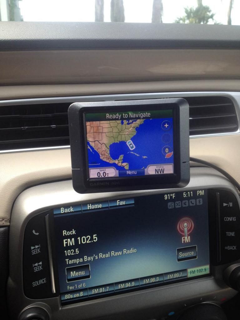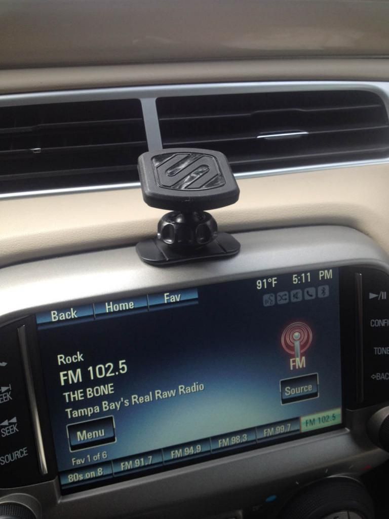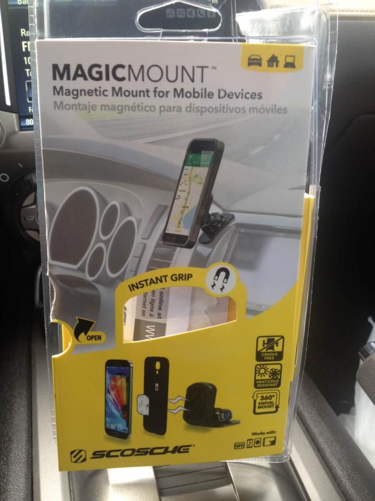 It comes with 2 different size thin pieces of metal with 3M sticky tape on one side to put on your phone, case (inside or outside), back of your GPS, or whatever device you want to stick to the magnet base. The magnet is pretty strong and can hold tablets as well. I stuck the bigger metal piece to the back of my GPS, and just placed the smaller one inside the back of my iPhone case. Here is the packaging: ![]() Here it is mounted on top of the MyLink frame: ![]() It swivels and can be tightened so it doesn't move too easily with car motion, but can be shifted left/right/up/down by moving the device you have attached to it. My Garmin GPS attached to it: ![]() I have the plug wrapped around the side of the MyNav frame and then into the 12V socket for now. When I pull apart my shift cover plate I will wire it more permanently and more out of sight. Since I was taking pictures with the iPhone, I couldn't take a picture of the phone on the magnetic mount, but it looks good as well and can be placed in any orientation. A standard 3-foot USB cord can reach from the USB port in the console to the phone so I can charge and play through the USB instead of Bluetooth. I will probably get a 6ft cable and wire this nicely. Just sharing another solution to the storage/space issues in the car. When I get in the car now, I take my iPhone out of my back pocket and stick it right to the mount quickly and effortlessly instead of dropping it into the cup holder (if it's not full) or doing the seat crotch vibe!