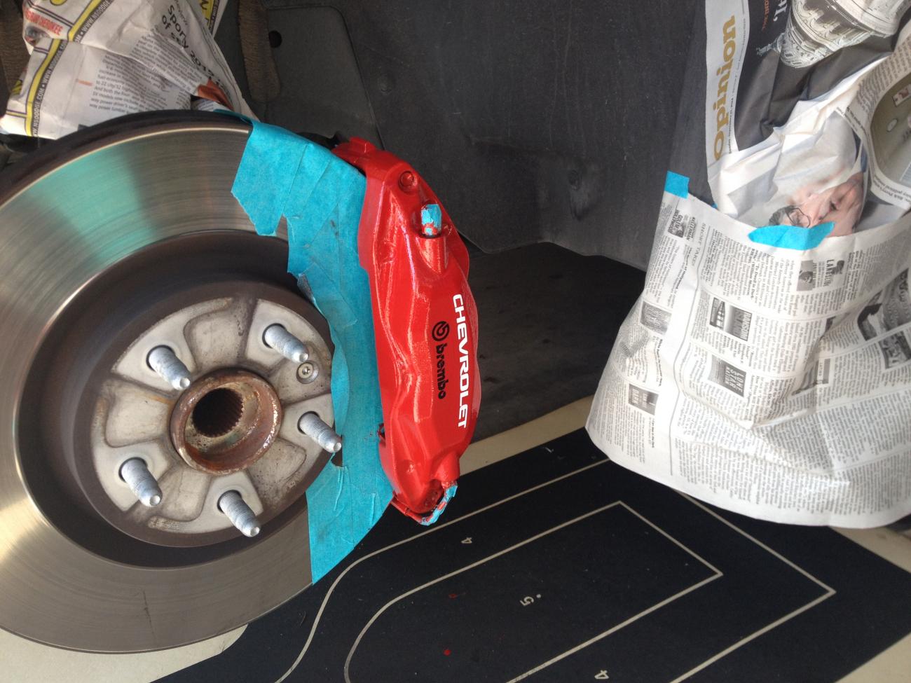Finally had some time to paint the calipers. 4 coats of the G2 paint, decals replaced, and then 4 coats of VHT High Temp Hi-Gloss Clear Sealer. Not as good as powder coating but still looks good.