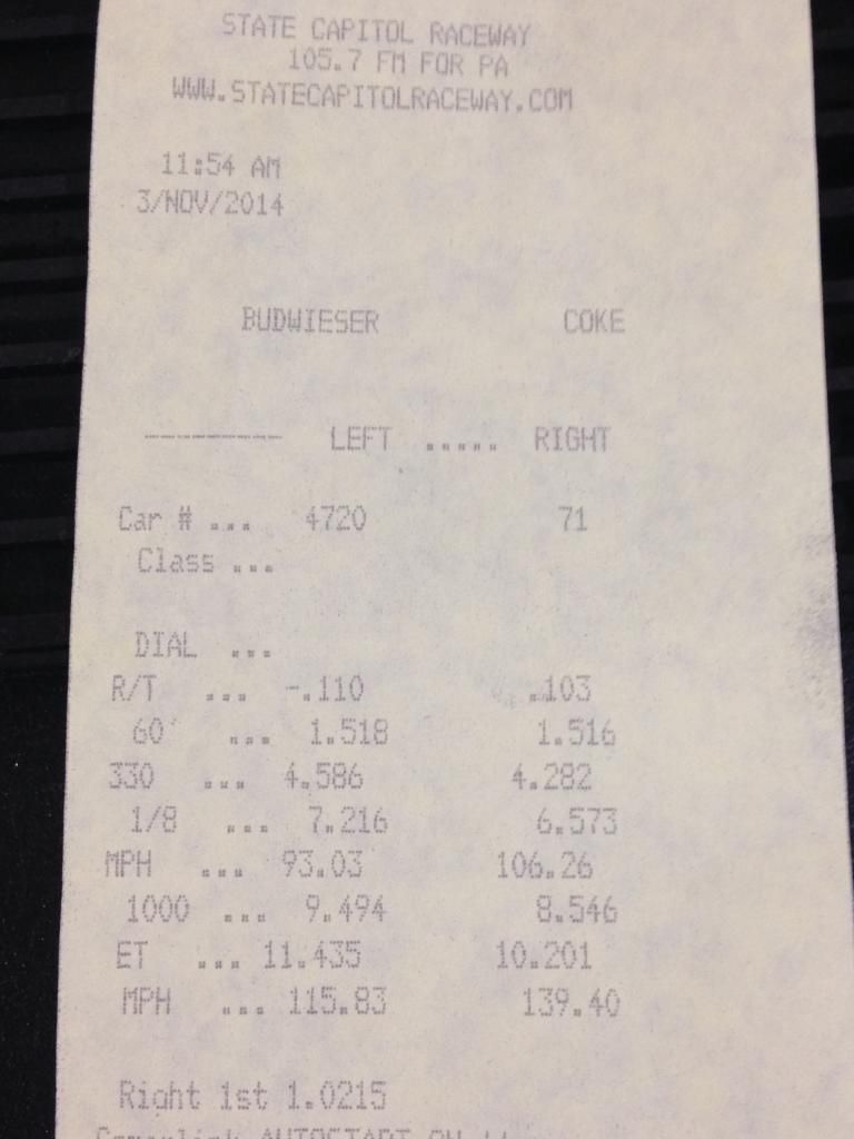 12.007@ 115.20 With 18" Drag Radials - 11.93 @115.19 Added a PTB 11.76 @116.59 With Yank SS3200 Converter - 11.63 @116.52 After PI and Tuning 11.44 @118.75 New Best