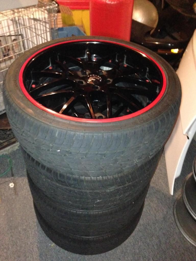 Three piece 22" forgiato I want them gone all they do is sit in my basement.. They look amazing on the car, its just I went with a drag set up. New the wheels alone where like $6000. Tires have like 60% tread. They were just my cruising around tires never raced on. Have never been driven in salt/snow condition roads. They do need to be refinished or wrapped because around the lugs the paint is starting to chip. No curb rash. And they do have the sensors