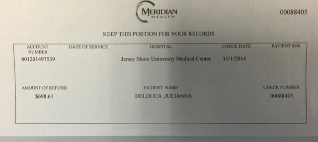 Sooo I grabbed the mail this morning and saw an envelope from Meridian Health. Didn't think much of it at first, then upon second look, it sort of looked like a check... As I was sitting at the light around the corner I opened it to find a nice refund check from my daughters surgery earlier this year...