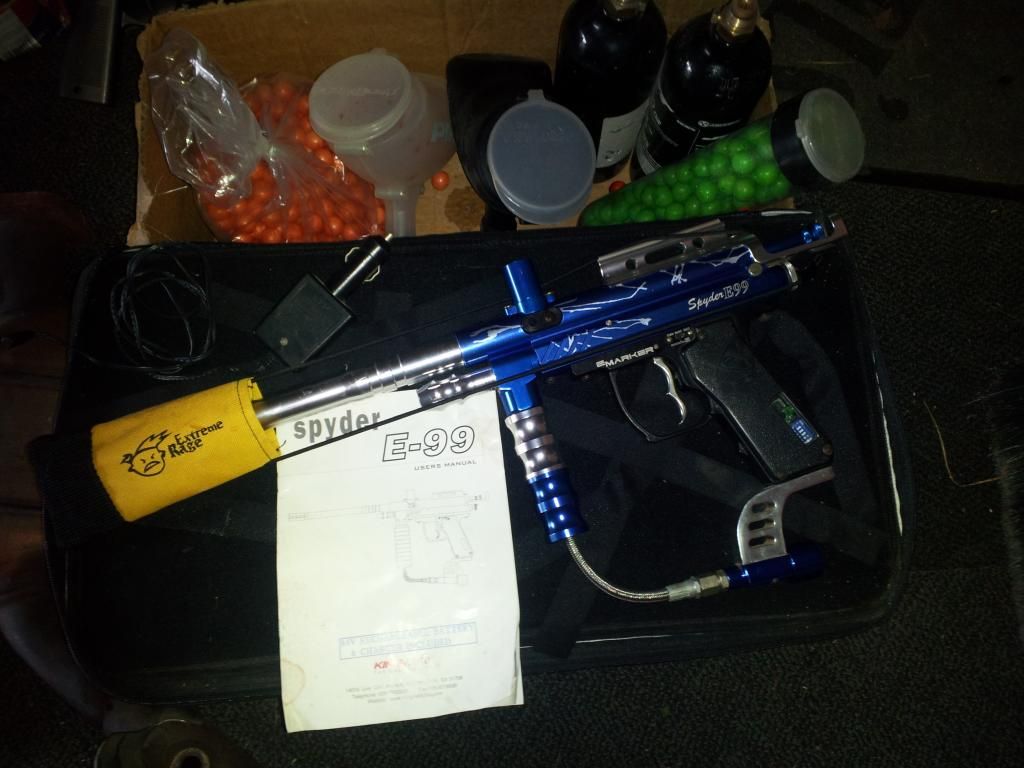Paintball gun and stuff. Spyder E-99, case, 2 c02 canisters, 2 loaders, mask, tubes, etc. Haven't used in years and dusty. My balls are really old and dried up. - $80 obo