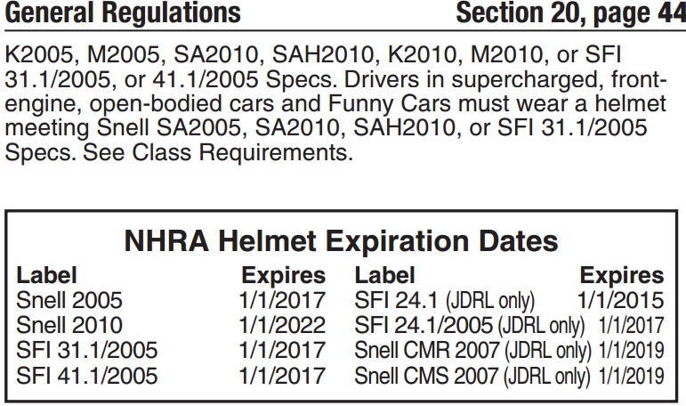 That got me worried, so I hunt down the official NHRA rule book, and sure enough it says SA2005 good until 2017, SA2010 until 2022.