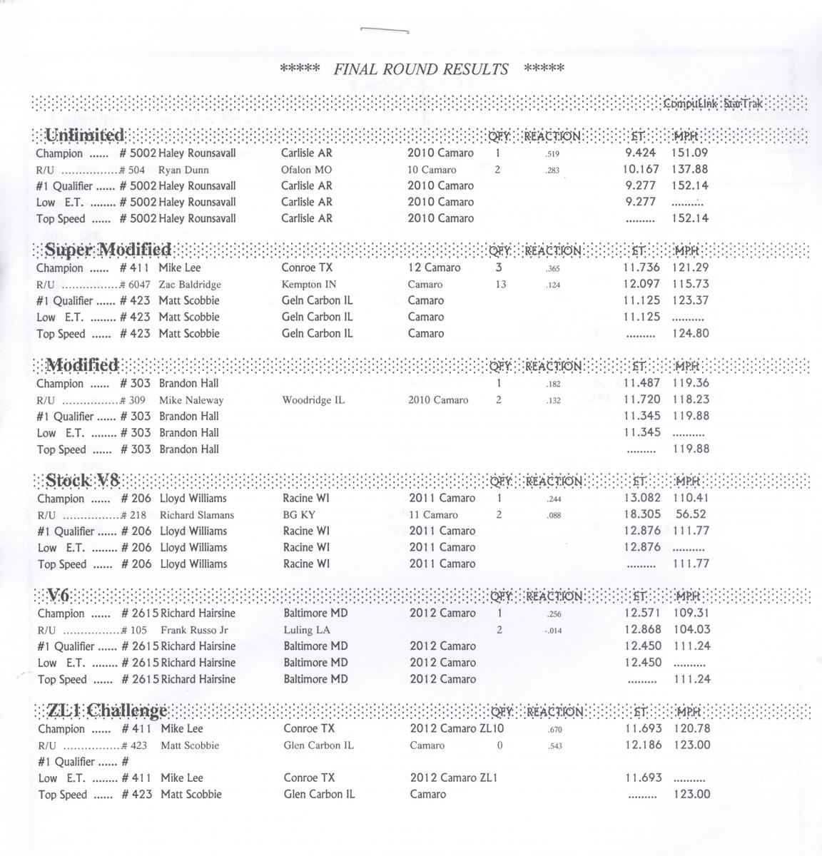 Very disappointed in how the drags where organized. Never heard M6 street tire class called. Was running in AutoX and asked how we could do both drag and auto. Pete at AutoX said they got together with Mlee and Drag would call over to Pete by cell at AutoX and Pete would send us over to drag. No call was ever received. Heard my name being announced as being eliminated cause of no show. Everyone says every year that members can do both, and every year this stuff happens. Oh, you can run, but if you are good enough to go deep in qualifing, then this happens. I didnt go to fest last two years cause of stuff like this. Had hoped things had improved. It hasnt.