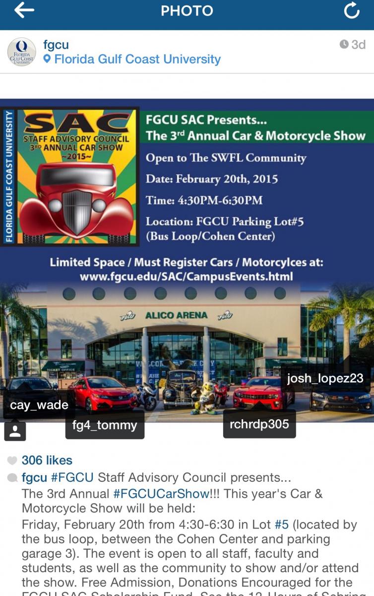 Florida Gulf Coast University is hosting a Car show on February 20th