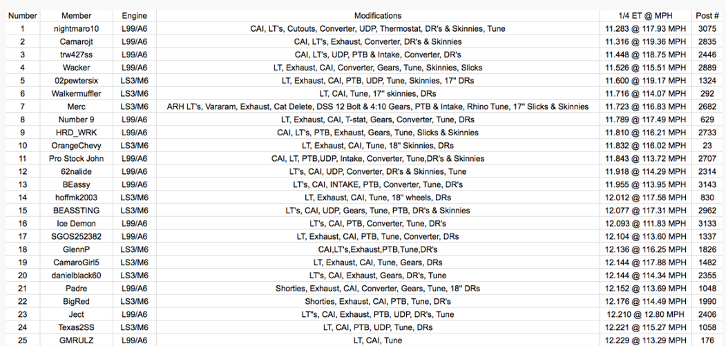 Don't look right. Bolt on L99s and LS3s without cam upgrades are running cammed Camaro times, WOW.