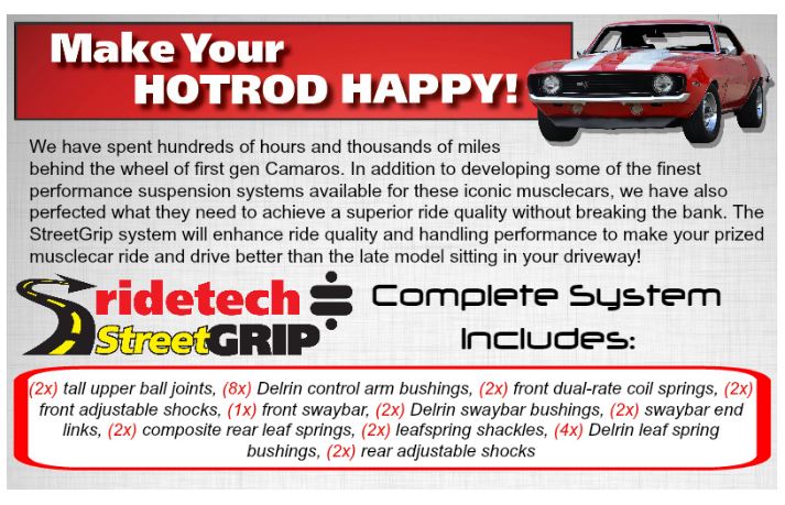 We have developed a new suspension package for the 1st Gen cars. The new StreetGrip kit provides the necessities to get your Camaro up to date.