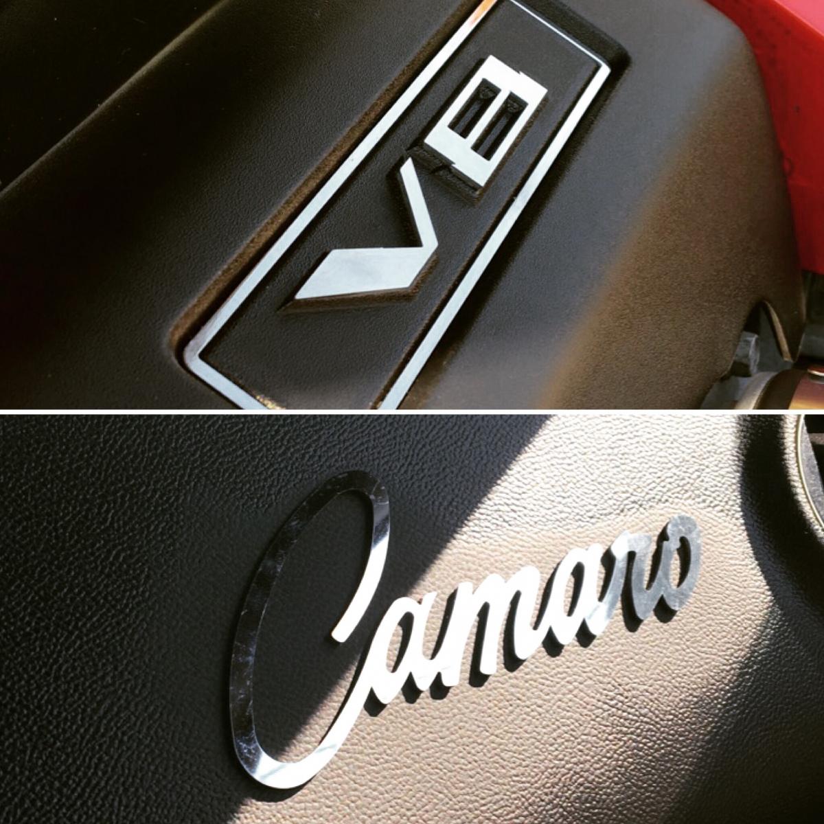 Added polished and mirrored V8 trim to the engine shroud and retro Camaro lettering to the inside of my passenger side dash