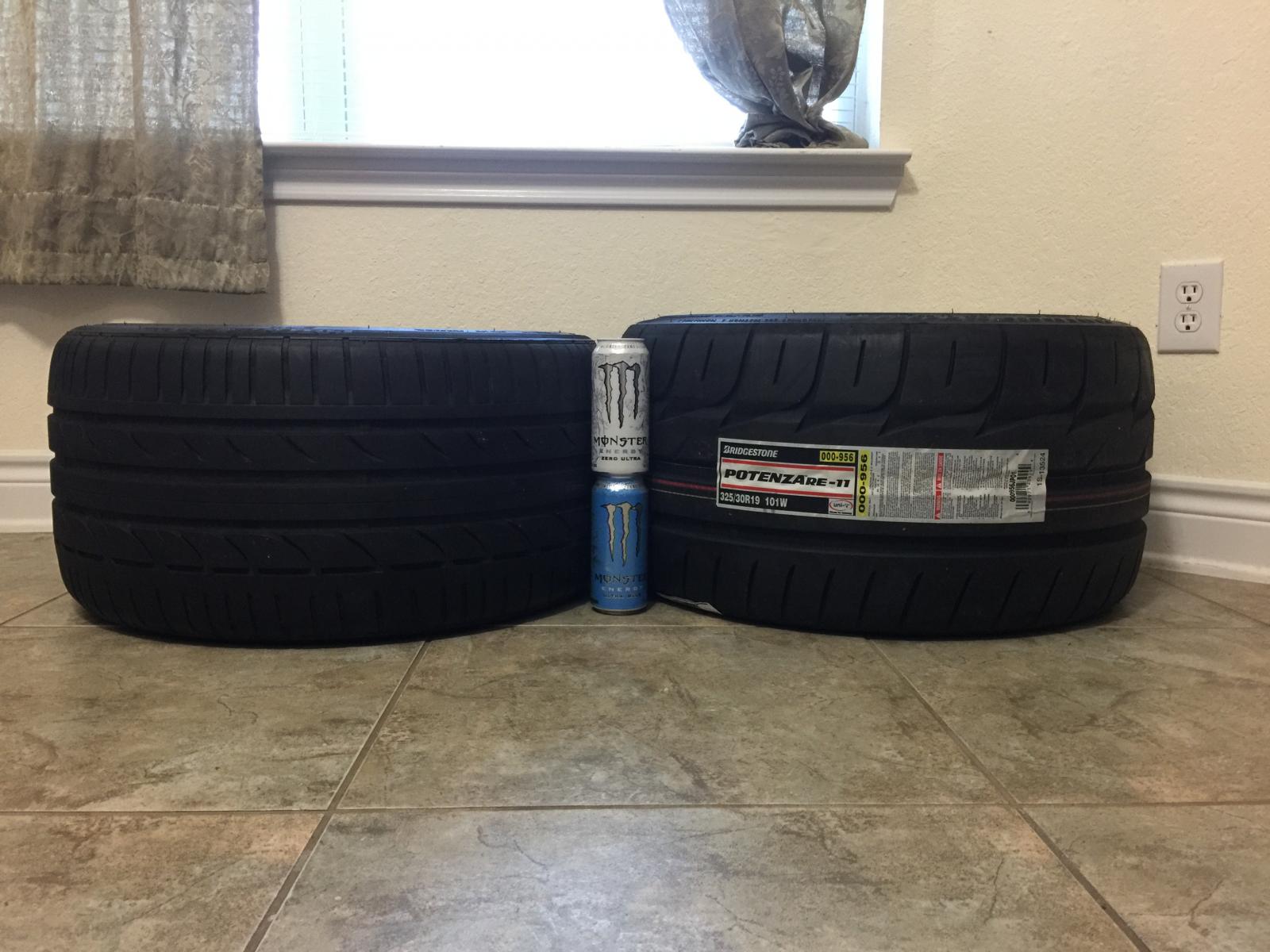 Here is a quick shot of my new Bridgestone RE-11 325/30/19 compared to a Bridgestone S04 305/30/19. These 325 will go up front. Looks about 1 inch wider.