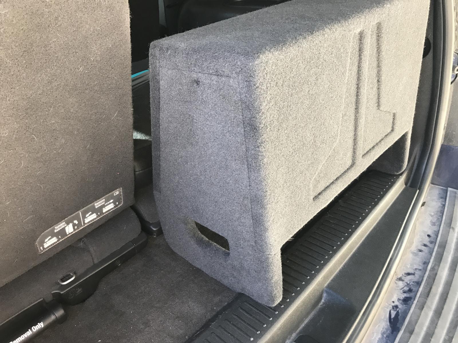 Get this, custom box behind the third row. Built with handles so it's easily removable should we go on family trips and need that extra room for luggage, etc. It's also got a quick disconnect. On top of that, it fires downward and they left enough room for my hands to be able to reach in under the box to actually use the levers to make the third row functional. Freaking SWEET. Tossed in a JL 600/1 amp, an audio controller, the bass knob, some thick as sh!t amp and speaker wire and voila, off we were. I am beyond floored at the fit and finish of the install and sound. Nick did me wonders on this one and I'm 100% satisfied.