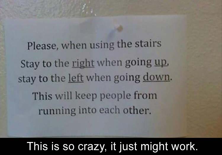 Think about it......some people just don't use their heads. if you stay to the right when going UP.....and if you are going DOWN stay to the left....YOU BOTH ARE IN THE SAME SIDE OF THE STAIRS!! DUH!