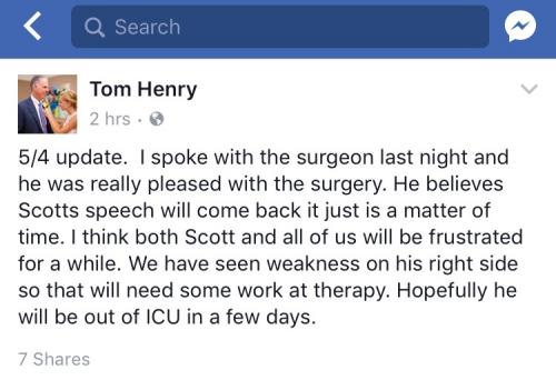 Update on Scott Settlemire. From Tom Henry on Facebook