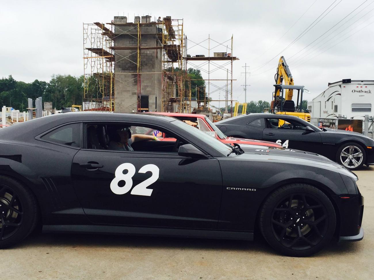 This is Mark's Pfadt lowered ZL1 in the fore ground with the 295/315 and my car with the same tires but on stock springs in the back ground at NCM.