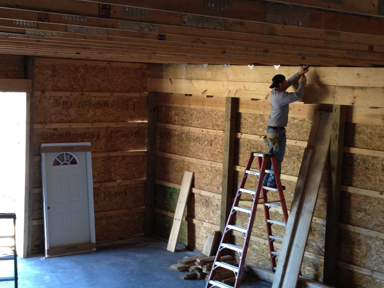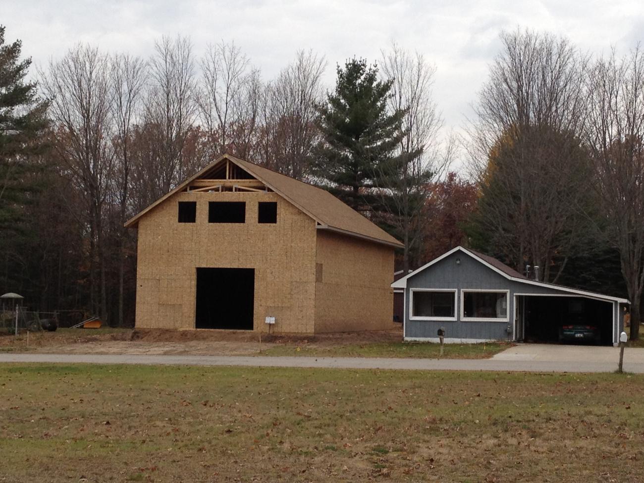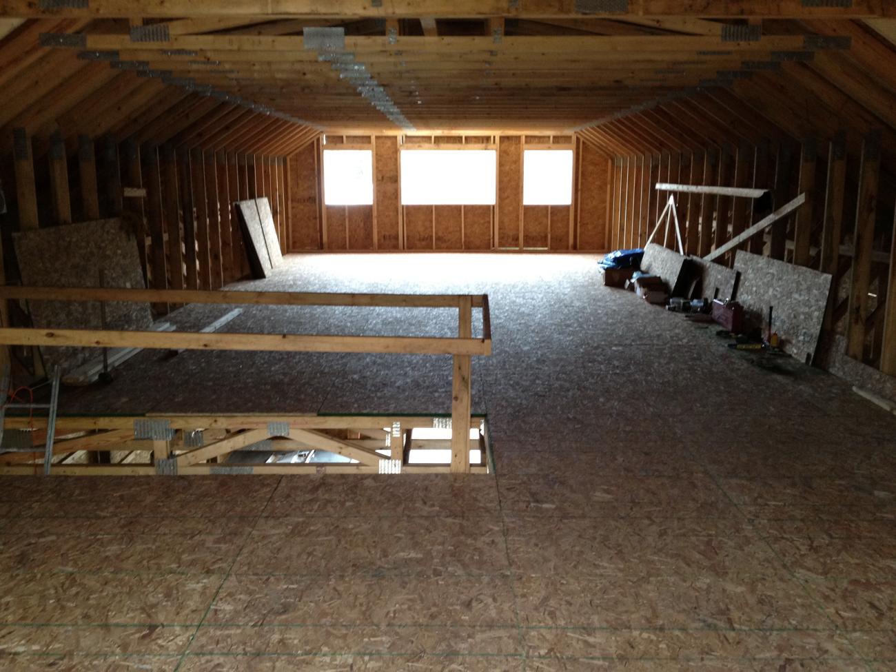 Soffet and Fascia are up.... Siding, window and door installation at the top of the list now!! below are some pics of the man doors, better views of the upstairs loft with 3 lake facing windows and the rear with a smaller window and slider. You can kind of see the bedroom size, from the staircase to the end wall with slider. Garage doors and siding are ordered and we are just waiting. |