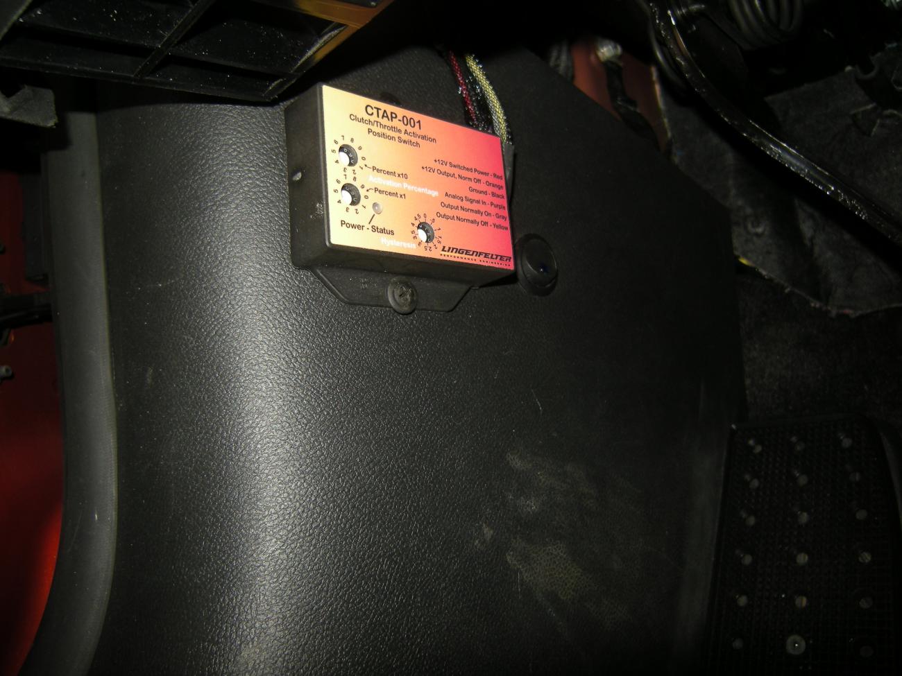 If anyone else needs any pointers on installing the Lingenfelter CTAP-001 Clutch/Throttle Position sensor, I will be glad to give pointers. Merc got the version with the longer Purple wire so any disconnecting and moving the actual adjustable unit would be easier..... something I mentioned to LPE while Beta Testing the unit. The biggest thing to help is Do Not remove the clutch switch to get the connector off..... looks like a royal PITA. I removed the same switch off the brake switch and examined how the connector came off and too a lot of pictures with my camera of the positioning of the current clutch switch harness using mirrors. Seem to remember bending a small screwdriver to make a good harness clip removal tool. Pulled the lower left footwell paneling off and fuse panel cover. Put drivers seat back as far as possible (didn't remove) and steering wheel as high as it could go. Left arm was a tight squeeze to get my hand touching the connector, and right arm under the dash with the home made removal tool was like playing a game of twister. Then had a printed out picture of the position of the connector to my side to reverence so I could interpret what I was feeling. Presto.... got it off. Installing the new one that goes between the OEM harness and the existing clutch switch is much easier than the removal. I also added just a tad of light bulb grease to the connection to make it slide on easier. But I would definitely stay away from removing the existing switch to do it. I have fairly big hands and was able to do it. Or.... have a friend or mechanic with smaller hand help you out. Switch works great! What I really like is being able to adjust at what point in the clutch pedal travel the activation occurs since all clutches have different engagement points... plus may need adjustment later as clutch wears and the engagement point starts to changes. Also, I maxed out the hysteresis to 4.5 to keep from any chance of on/off problems if close to the engagement point in the clutch pedal travel..... since I have the triple carbon clutch and Really engages! (may play around with the adjustment later for fine tuning) For those that don't know, the "hysteresis" that Jason Haines from Lingenfelter built in, is so you have a "window" for the activation point - without this feature, if you have the clutch pedal at the activation point and moved slightly (like during hard launches)..... the activation could be turning on/off instead of staying activated. His install instructions explain everything really good. I'll post the same thing in my thread build at post #125: