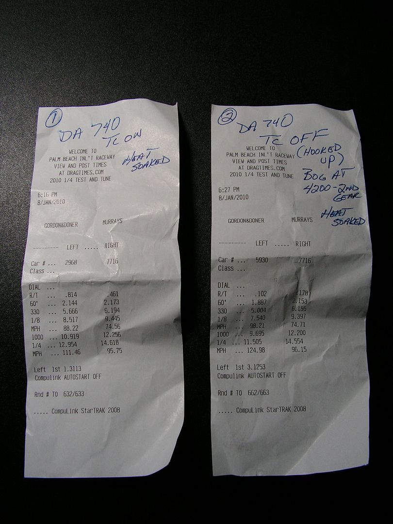 On the subject of the Trifecta Tune... I did my first runs at the track on the tune with NO improvement in either time or, more importantly, MPH! I did not have the tranny tune installed for these first runs so I could give a read of how much just the engine tune helped in the 1/4 mile. I loaded the TCM tune and was in the lanes when the rain came Friday nite so I didn't get a run with it installed.