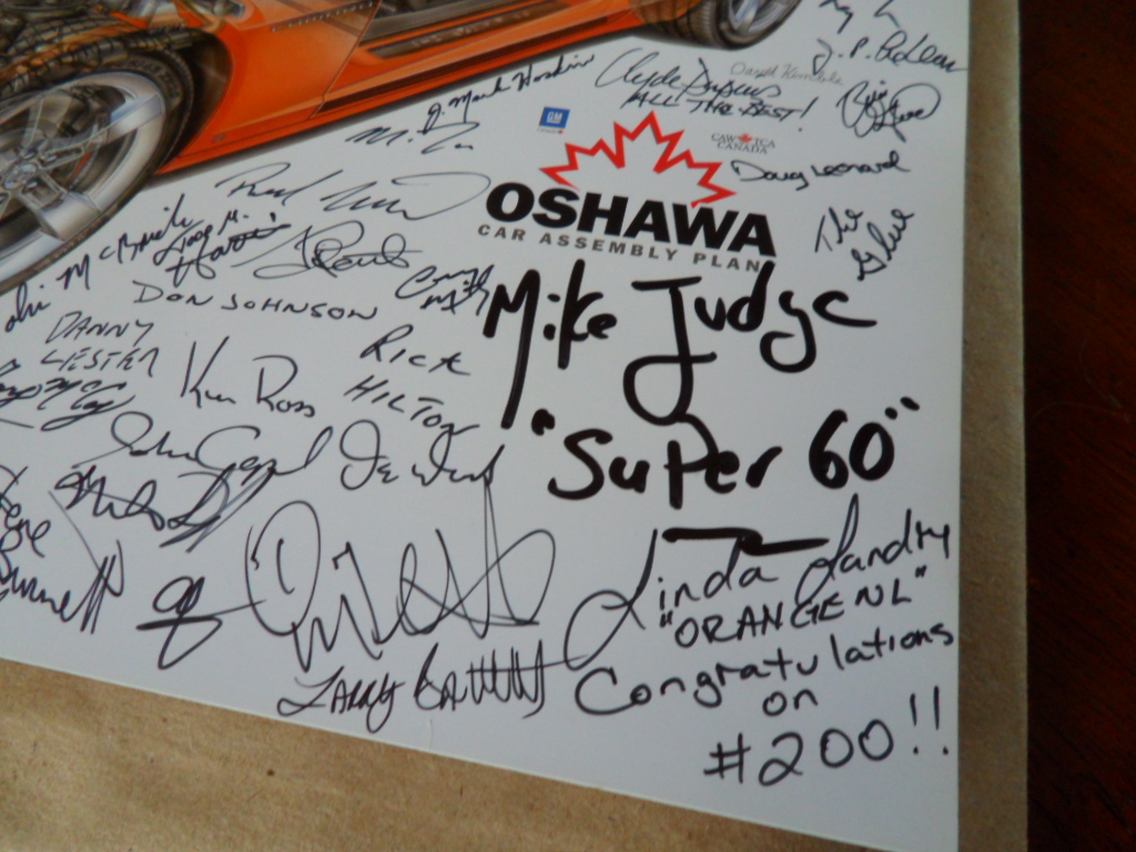 Here it is folks! Here is some pictures of Autographed Litho #200 of 200. The LAST autographed Litho to be made by our good friend Mike Judge (Super60).![]() Signed by a record number of GM production employees, this item will be auctioned off to the highest bidder at the BBOMG Friday Night Dinner. The VIN details and cover letter will be customized to the winning bidder so it will always be associated with your car and Mike has even left some space so you can gather some more autographs on the Saturday. All proceeds from the auction will go to Big Brothers / Big Sisters! Thanks again to Mike for all his hard work and dedication just in his normal job in Sheet Metal! Doing these autographed Lithos is simply the product of a great guy with a huge heart going above and beyond!! (The Fine Print: The winning bidder will have 24 hours to pay their highest bid. Bid prices are in Canadian dollars. Payment must be made either by PayPal or cash. I will make payment arrangements after the close of the auction.)