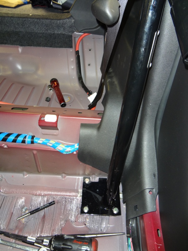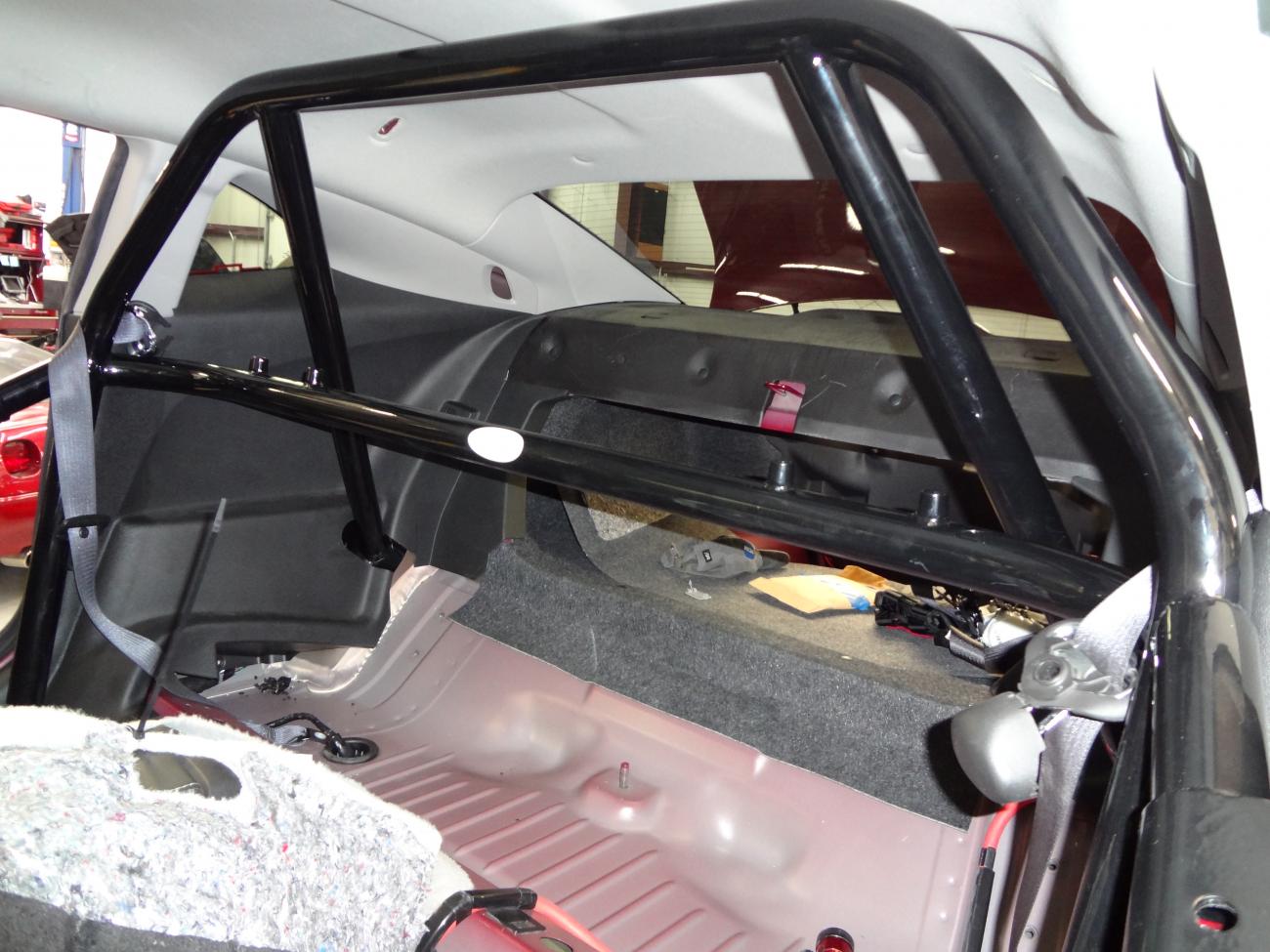 If you look at the back part of the upper quarter trim, you'll note the holes in them... This is where the rear seat shoulder pieces came out... I have removed any and all seat belt components as I can promise with the eight point cage, there will be no room for anyone back there.... and you would have to be a serious contortionists to get back there anyway... I still have to put the hanger clips back on, as well as lots of other items...